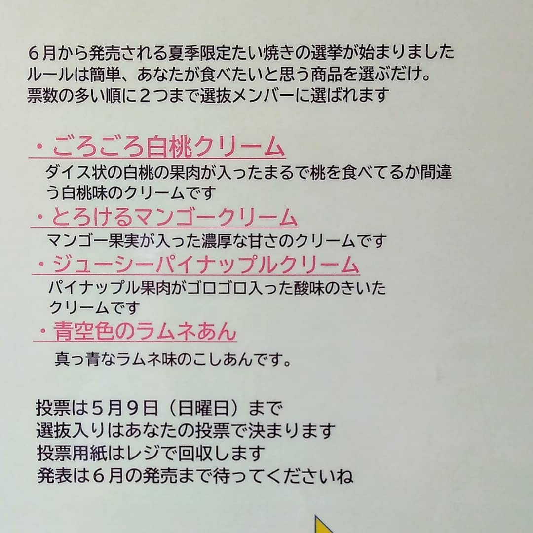 6月~9月は夏季限定クリームが入ります。今年は何?それはお客様の投票で決まります。名付けて『2021 TYK48 夏季限定たいやき 選抜入り総選挙』始まりました。うちの店は本家AKBより選抜入りが難しいと噂されるほどシビアな戦いです。投票は一人一票なのでCD買い占めての組織票は出来ません。握手会に来て応援も出来ません(笑)純粋な票の積み重ねで決定します。特別にインスタでも受付します。あなたはどれが食べたいですか?